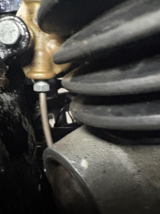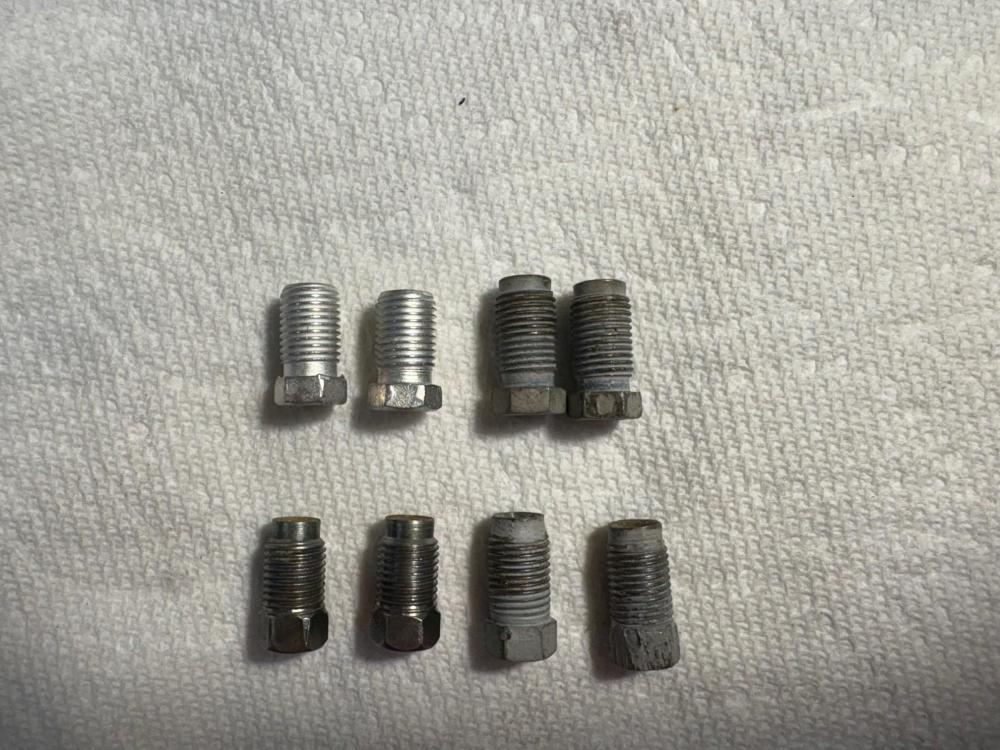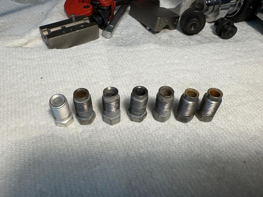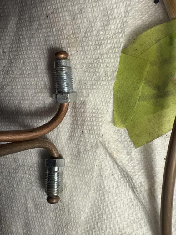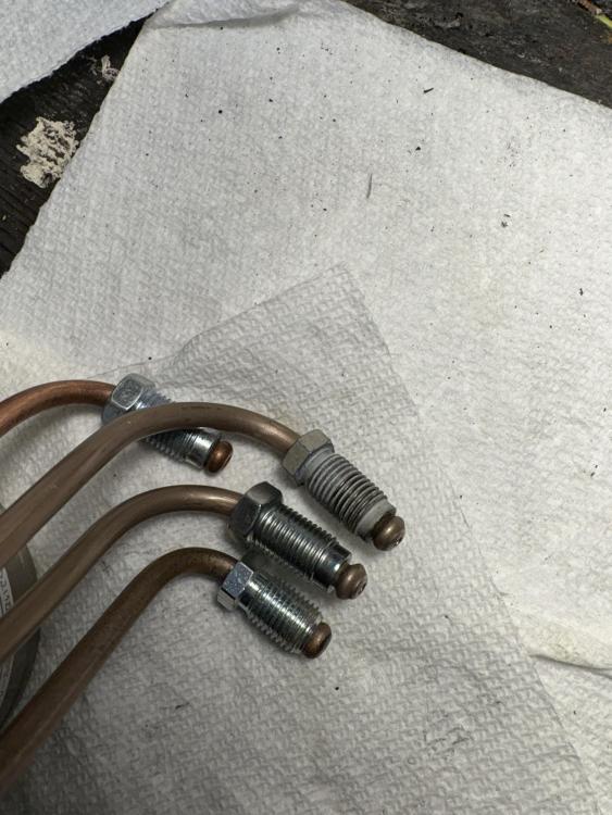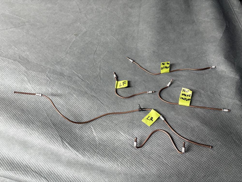 I made up a few brake lines today... The thing is that I think I have to get different fittings from a Hydrovac 404 for the small one in the foreground with no label on it. That's because it is a DIN 45 degree bubble flare and I had a small ziploc bag with the original fittings in it, which I had forgotten about, and they have a long unthreaded nose.... The older line I made up for those front cylinders with incorrect DIN fittings (flat on the back, bubble in the nose) are in this photo for comparison. The long nosed ones were not easily snugged into the cylinders, so they too are incorrect. So I will finish making, and install all the others but I think I need to reflect on the front cylinder-to-cylinder lines yet again.....