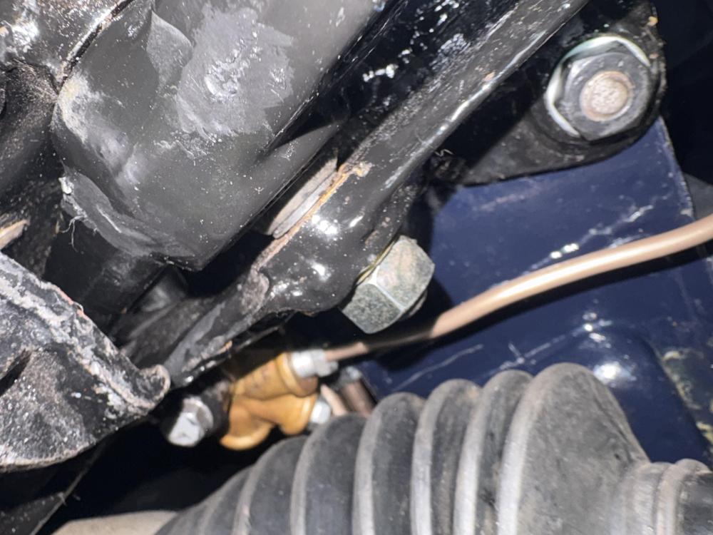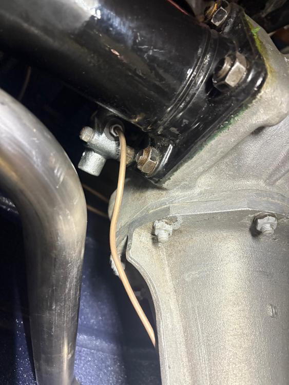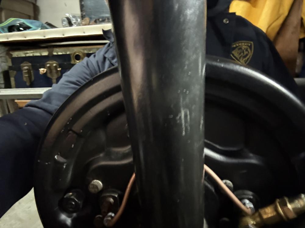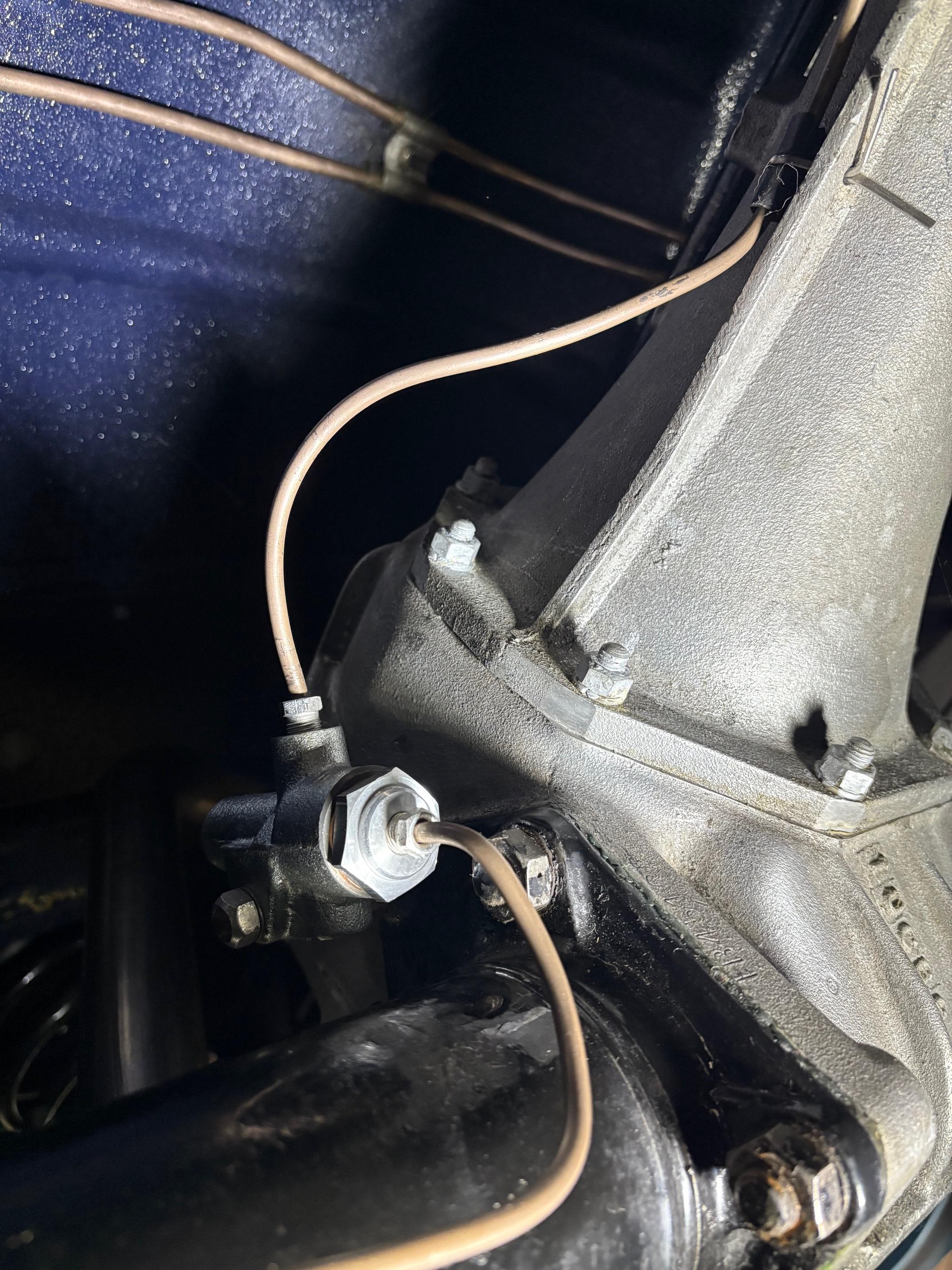 So Alveas sent me lines with two different types of fitting. The upper one is correct.....according to my original fittings that can't be re-used.... ...so I made another that was identical to the correct one... Alveas correct line at the upper left; one I made with a Peugeot (but not 404) fitting on the upper right and below that, the one I made to replace the incorrect Alveas one which is at the bottom. RF wheel LF wheel The metal brake lines can all be removed and replaced with the engine in situ but it's not easy. I had to cut the rear line to the correct length (mm-perfect!) under the car and flare it there, and then connect it to the splitter with the splitter not yet mounted to the crossmember. That's because the steering rack in a LHD car will prevent access to the fitting nuts for tightening if it's on the X-member already. Cut the RF brake line under the car too and flared it there and that one can be mounted with the splitter on the X-member. The next step is to take the Hydrovac out and tighten the RF brake line on the splitter and mount the last metal line that attaches to the firewall. Then it should be ready to bleed.