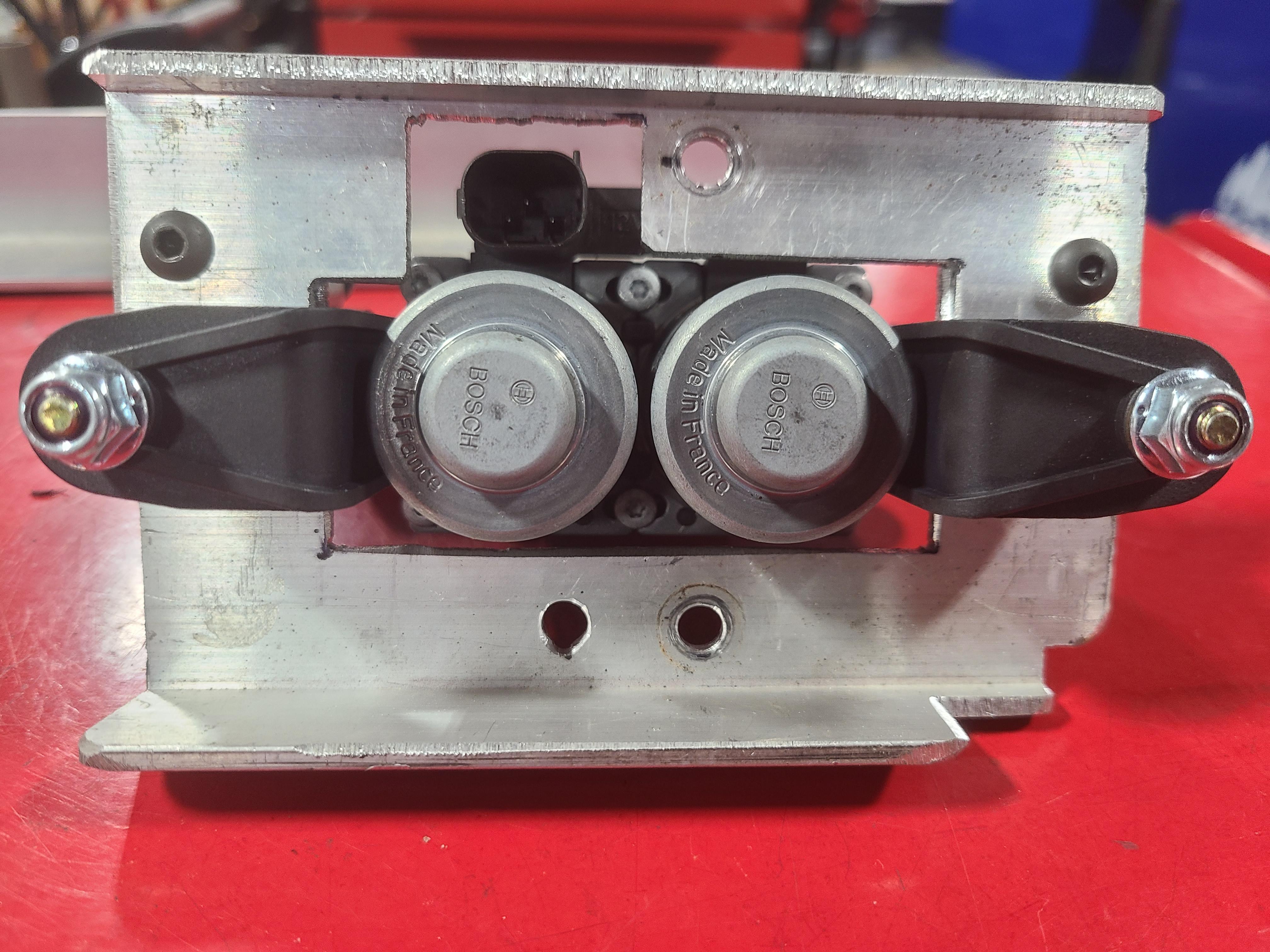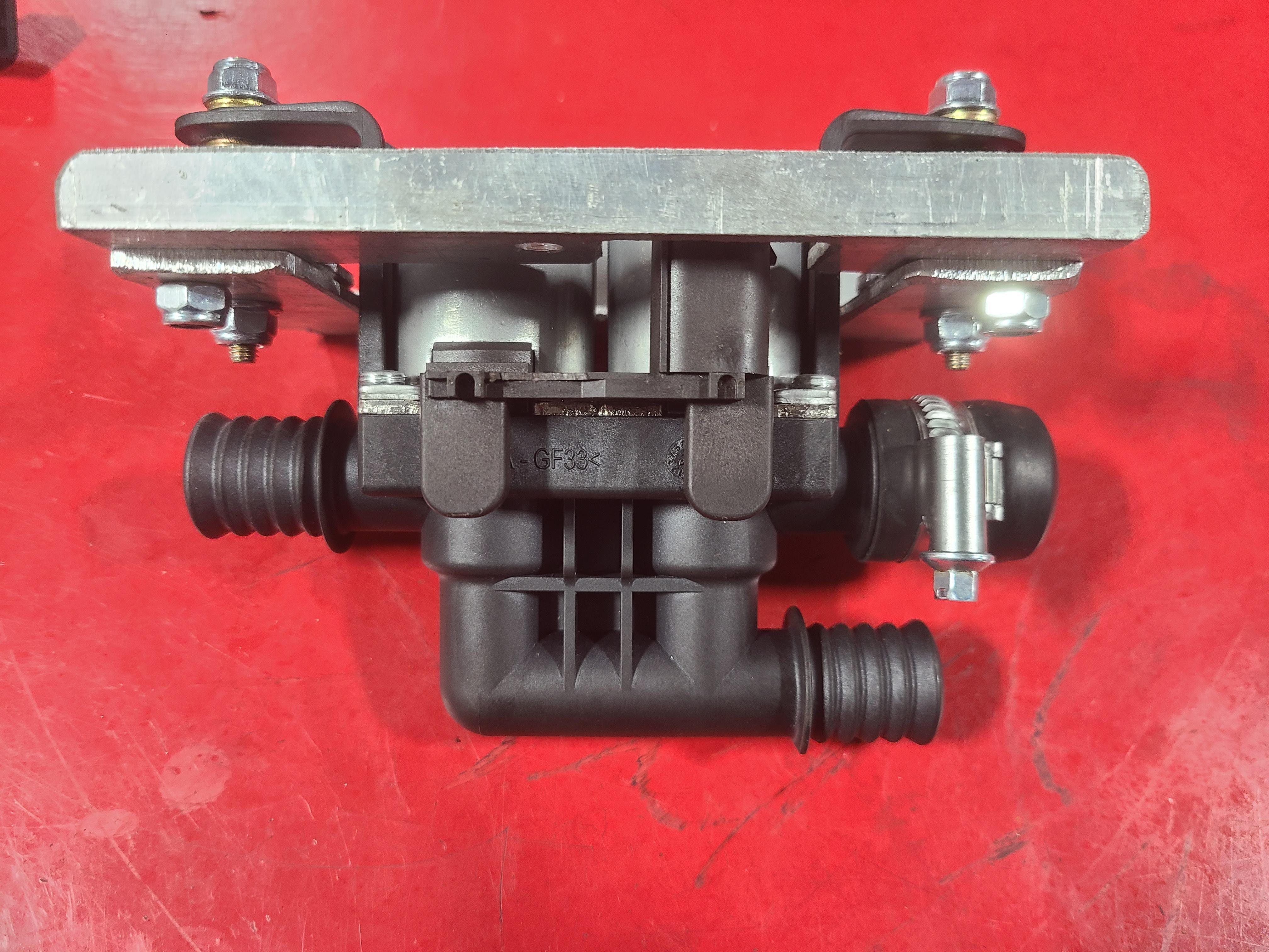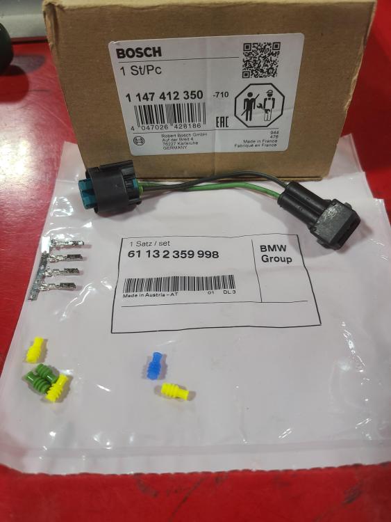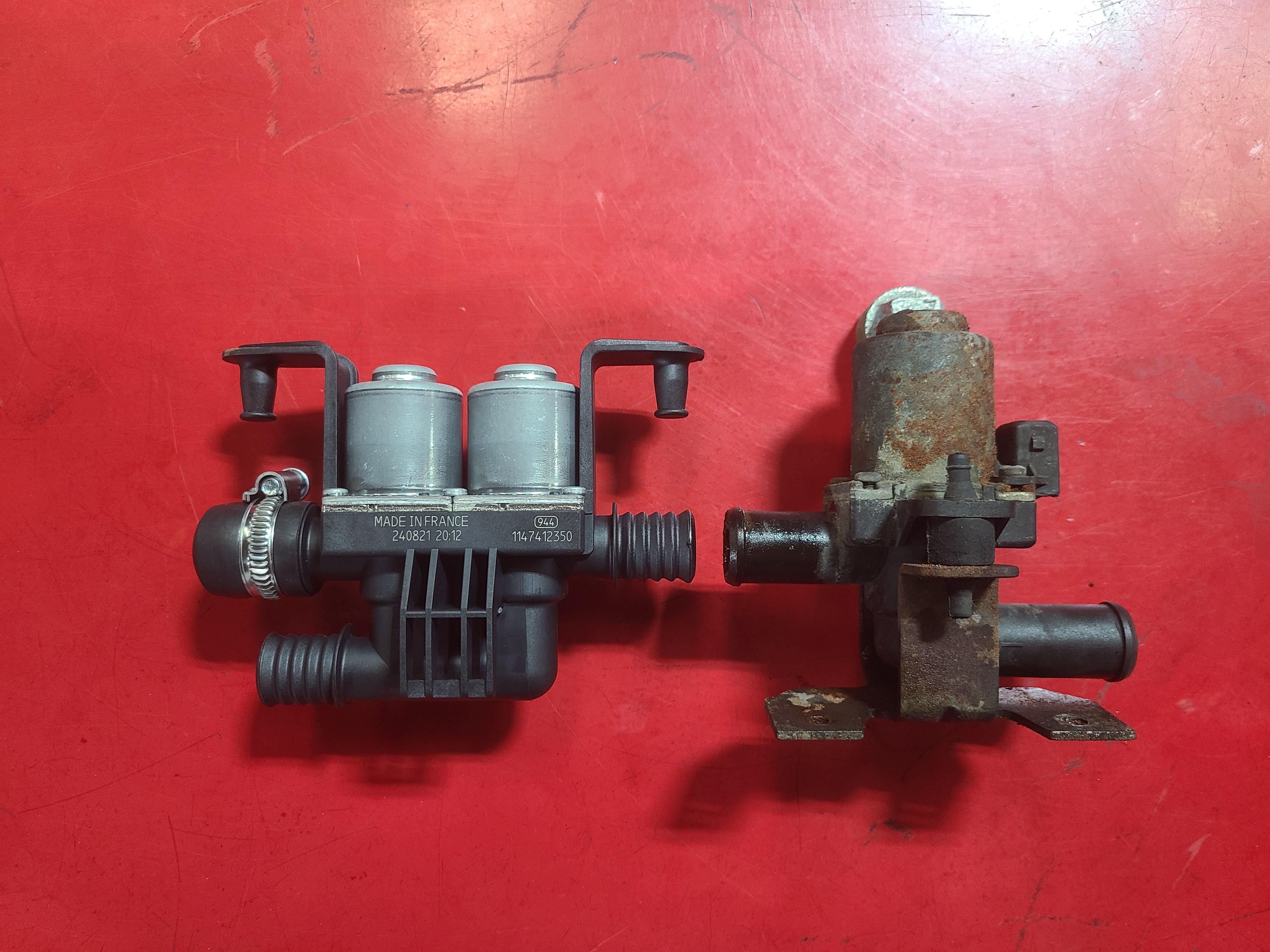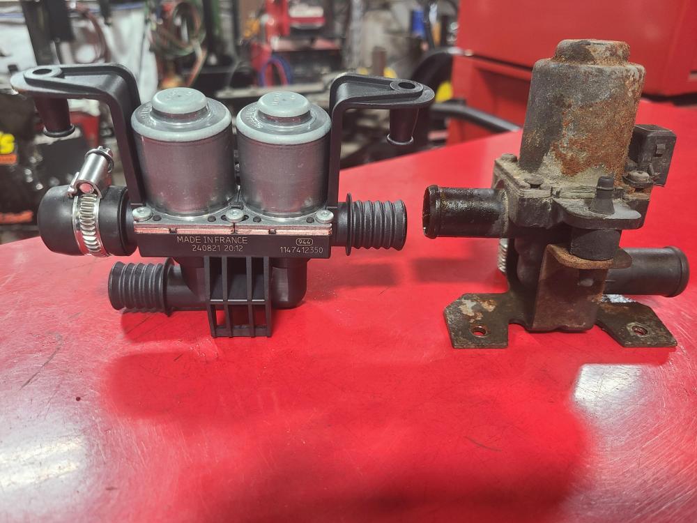 In late summer, my heater started pouring out full hot no matter where the temperature control was set. When current passes through the valve it closes, so any electrical problem will result in full coolant flow, wide open. I pulled the glove box and the climate control ECU. The resistance through the heater control valve was around 3 MΩ. According to the 505 tech training manual it should be 20 to 25 Ω measured at the ECU and 11 Ω measured at the valve. (I'm sure this site is linked to somewhere else, but here it is again: http://peugeot505.info/. It's a pretty old site which hasn't been updated for a long time and it could disappear at any time, so download anything useful. Click on "Manuals".) I checked resistance at the valve itself, which on a V6, is mounted under the cold air intake on the right side. Pull out the air filter box and MAF, then the air intake tube. Viola! there it is. (If you're looking for it on a different drivetrain just follow the heater hoses under the hood.) It measured the same resistance, so I set about finding one. The Bosch number is 1147412020. I tried both that and the Peugeot part number which is 6461.90 in Google and followed every link. I did find some places in Europe that listed it, but most didn't have one and those that did won't ship to the US. In the 90s and early 2ks I used to relace a lot of these types of valves, mostly on MBs and BMWs, so I thought I could find something else I could use. A lot of them were Inlet-Outlet 90° from each other, but Peugeot's is straight through. A lot of them have also been discontinued, so I ended up using BMW# 64116910544 (Bosch 1147412350) and connector kit BMW# 61132359998. I got both of them from FCP Euro for around $100. It is a double valve for dual climate control on X5s and X6s up to 2019 so they should be available for a while. The hose nipple size is also 20mm so no adapting is needed. The one outlet needs to be capped off however. I used a 3/4" cap (Dorman brand I think) and a clamp, see pictures. These types of valves are always rubber mounted because to regulate the temperature they cycle open-closed, the ratio varying with how much heat the cabin needs. If they are mounted solidly you can hear them thump from inside the car, so if you don't mind that you can skip the rubber mounting and save yourself some grief. The lower nipple that feeds the two valves is the inlet and needs to face the front of the car in a V6 or whichever way the original valve was oriented in something else. If mounted backwards the valve may not open because there is just a fairly weak spring operating on it when the current is switched off and the coolant flow is fighting it. As for the electrical part, hook up the wire (33R) that has ignition power when the key is on to terminal 1 (clearly marked on the connector housing) and the other wire (137) that goes to the ECU to terminal 2. Don't forget to use the seals that come in the kit to keep water out. They slide on the wire before the connectors are crimped on. The smaller end of the seal is slid up to the crimp and the two longer ears of the connector get bent around the seal to hold it in place. There are two different sizes and blanking plugs. Put a plug in cavity 3. I did this a few months ago and there's a lot of water under the bridge since, but there should be a lock in the connector shell you will need to slide off to one side a couple of millimeters before inserting the connectors. You might have to remove the big seal from the shell to do so. The lock tab will probably go between the "square" part of the connector and the crimp, so keep the wire just barely past the crimp with the insulation ending just before the crimp and orient the connector the right way as it goes into the shell. As you can see, I made a jumper, but the male end that plugs into the car harness may be hard to come by. I also trimmed off some of the BMW mounting points with a bandsaw, but be careful. I also had to modify the cold air intake tube with a heat gun to get it all to clear, but if you cut off the two mounting bits that stick up from the valve you may not have to. All in all, it works like the original.